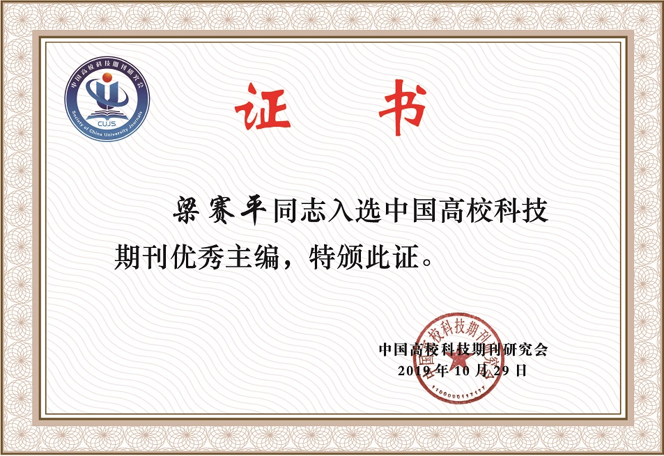 中国高校科技期刊研究会第23次年会于2019年11月6日-9日在成都召开,年会发布了2019年中国高校科技期刊“优秀团队及优秀个人”。梁赛平副编审入选中国高校科技期刊优秀主编。