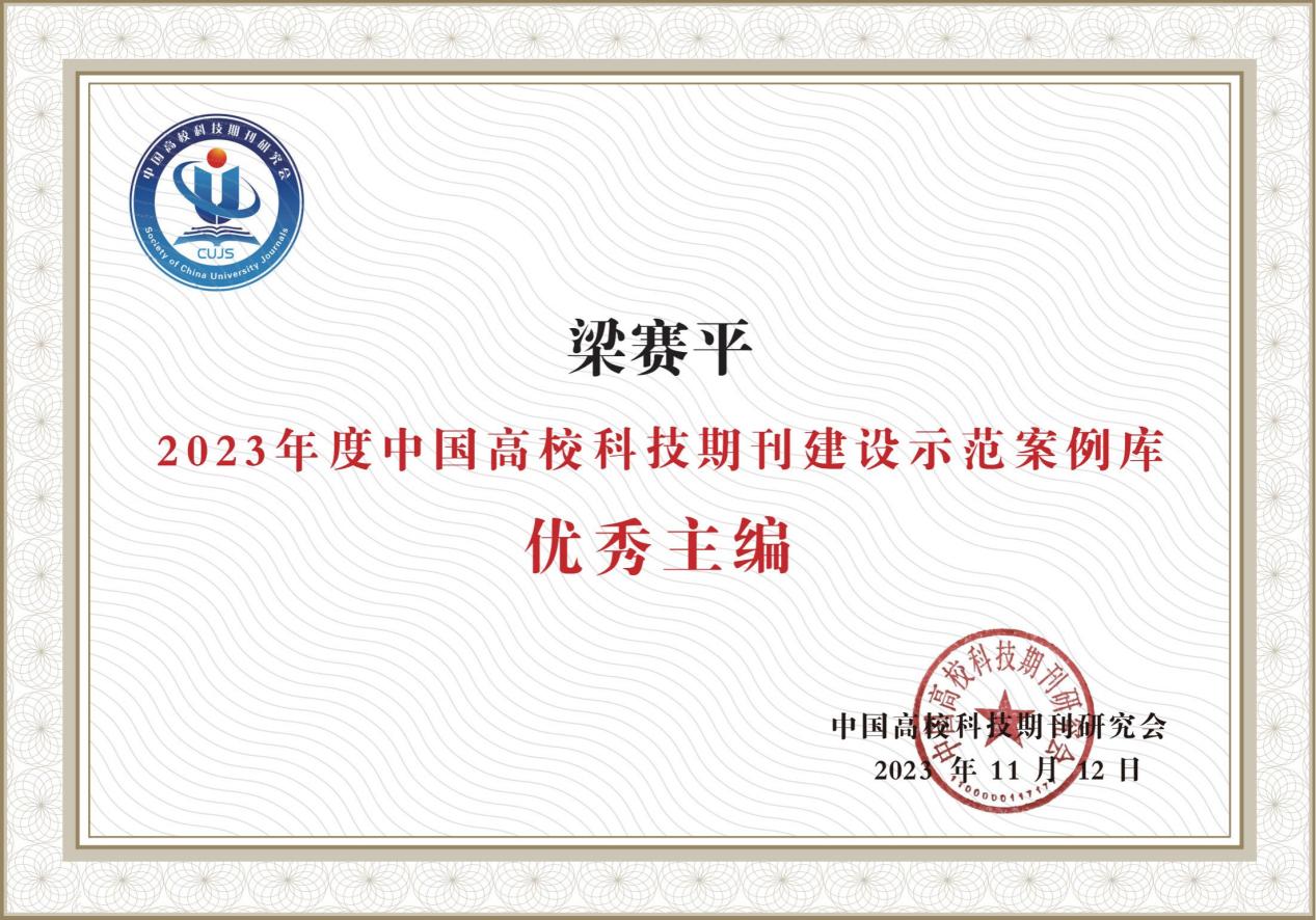 2023年11月14—17日,中国高校科技期刊研究会第27次年会在海南省海口市召开,会上公布了发布“2023年度中国高校科技期刊建设示范案例库·编辑团队及编辑个人案例”和从事高校科技期刊编辑出版工作30年荣誉证书;“2023年度中国高校科技期刊建设示范案例库·金笔论著/银笔论著/铜笔论著案例”。